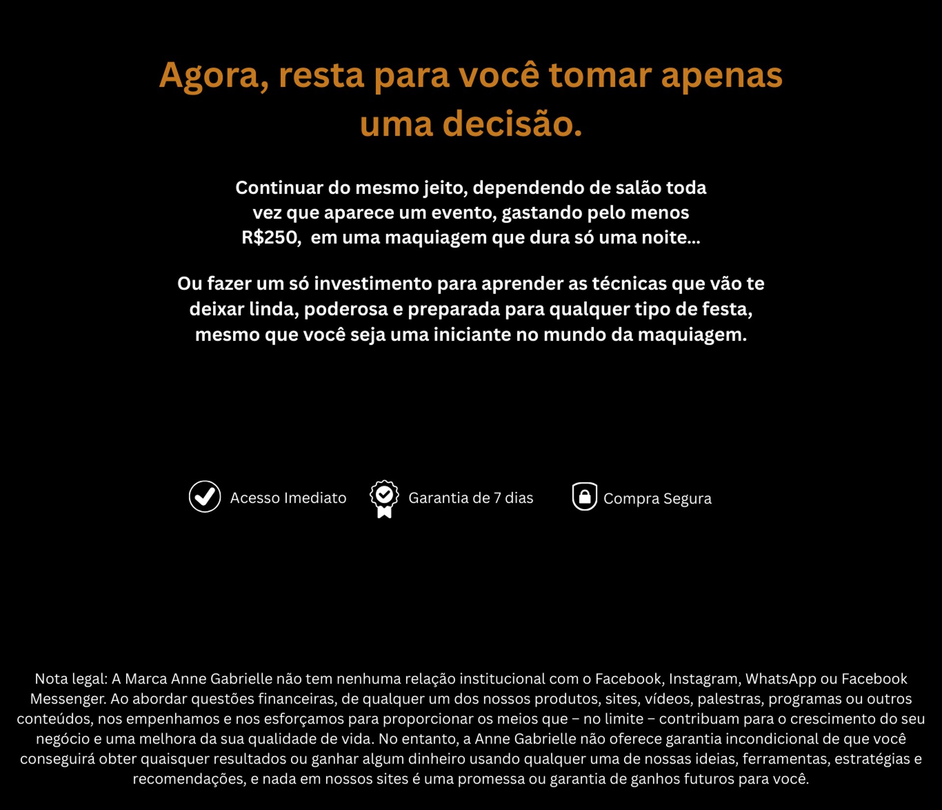 Você tem 7 dias de garantia total. Assista as aulas, experimente as técnicas, aplique no espelho. Se não gostar, é só pedir reembolso e devolvemos 100% do seu dinheiro.